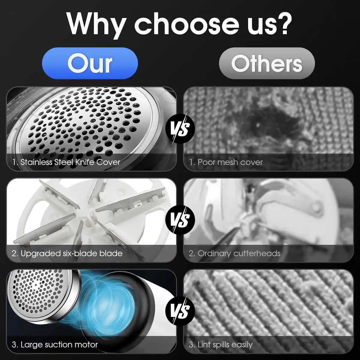 Power and Precision: Ultra-sharp stainless steel blade system designed to cut lint cleanly and safely.